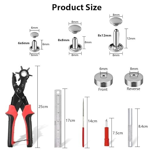 - Complete Rivet Kit: The set comes with 2 matched mandrels and 240 rivets in three sizes and four colors. Eyelet sizes include 6x6mm (15/64″ x 15/64″), 8x8mm (5/16″ x 5/16″), and 8x12mm (5/16″ x 31/64″). Ideal for adding decorative and functional rivets to shoes, clothing, crafts, shoelaces, and more.
