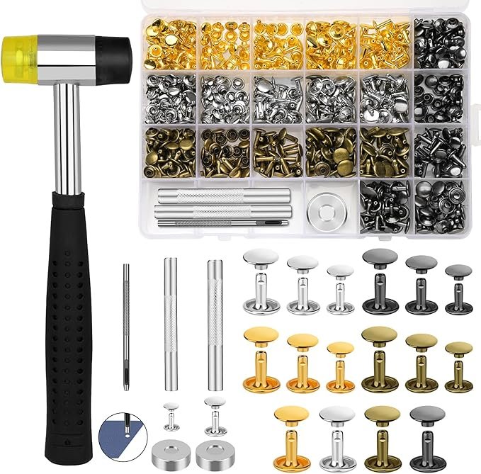 • Great Value Set: The kit includes 240 sets of double cap rivets: 60 gold (20 in each of 3 sizes), 60 silver (20 in each of 3 sizes), 60 brown (20 in each of 3 sizes), and 60 black (20 in each of 3 sizes). Also included are 1 double-headed rubber hammer, 1 anti-slip punch, 2 rivet bars, and 1 rivet base—providing a variety of options for all your projects.